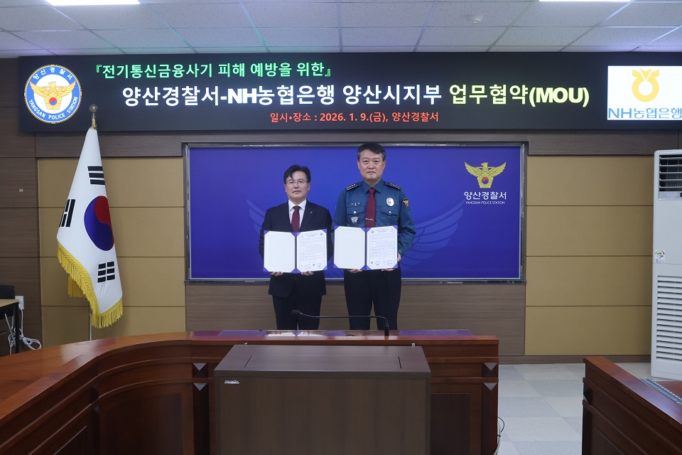 NH농협 양산시지부는 9일 오전 10시, 양산경찰서 중회의실에서 양산경찰서와 전기통신금융사기 예방을 위한 업무협약(MOU)를 체결했다.