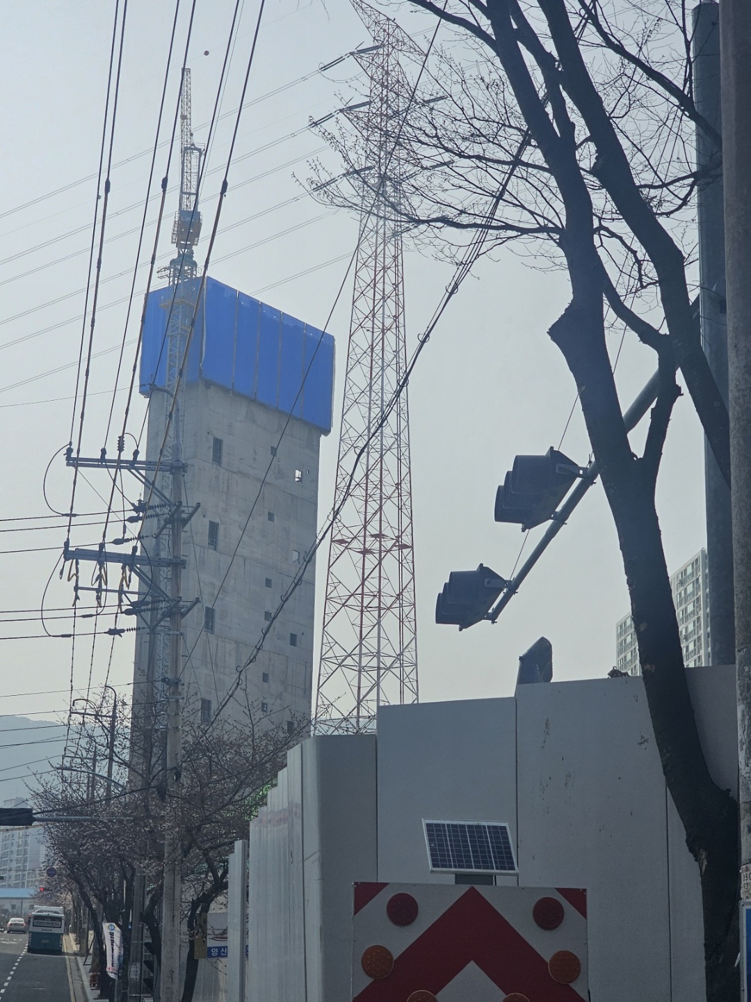 양산시 평산동 코아루 아파트 인근에 건설 중인 옥내형 송전탑 공사 현장. 주민들이 거주하는 아파트 단지와 불과 30m도 떨어지지 않은 곳에 거대한 철골 구조물이 위압적으로 서 있다. 최근 대법원의 집행정지 기각 결정으로 법적 제동장치마저 사라지면서 공사는 더욱 속도를 낼 전망이다.