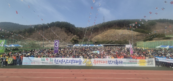| 천성산의 봄기운을 만끽하며 출발선에서 화이팅을 외치는 3,000여 명의 참가자들 |