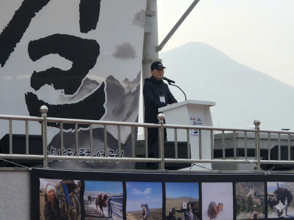 | 이희종 축제위원장이 '제4회 천성산 생태숲길 유라시아 걷기축제' 개막식에서 시민들에게 환영의 인사를 전하며 힘차게 축사를 하고 있다. |