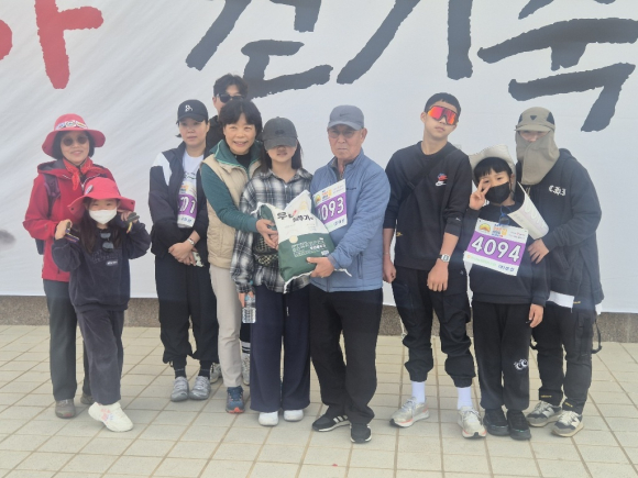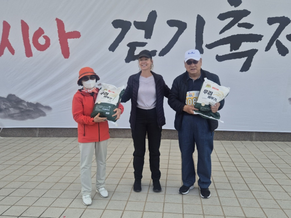| 세계적인 도보 탐험가 안젤라 맥스웰(가운데)이 '제4회 천성산 생태숲길 유라시아 걷기축제'에서 85세 최고령상을 수상한 어르신들과 함께 기념 촬영을 하며 환하게 웃고 있다. |