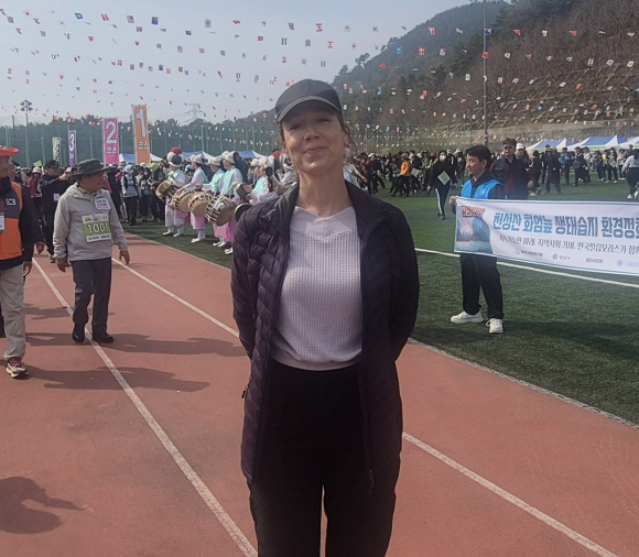 | 제4회 천성산생태숲길유라시아걷기축제에 참가한 세계적인 걷기 탐험가 안젤라 맥스웰(Angela Maxwell)이 양산시 웅상체육공원에서 밝은 표정으로 카메라를 응시하고 있다. |