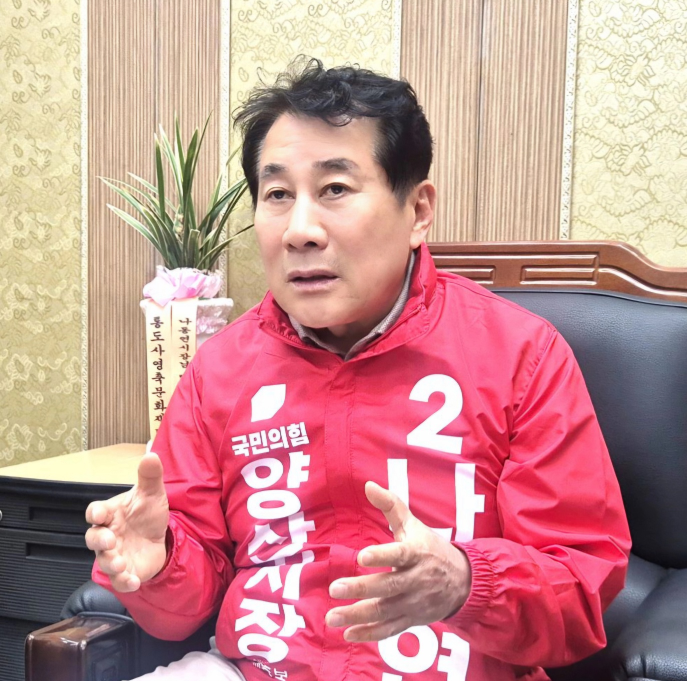 | 나동연 양산시장 예비후보가 선거 사무실에서 진행된 본지와의 인터뷰에서 웅상 지역의 행정 기구 개편과 ‘동부청사 시대’에 대한 구상을 손짓을 섞어가며 열정적으로 설명하고 있다. (사진=웅상신문) |